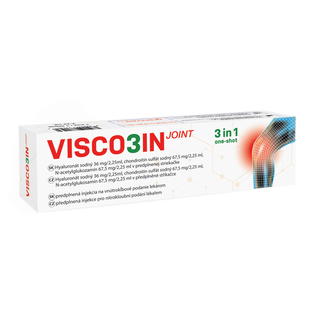 Injekcia do kolena resp. do kĺbov VISCO3IN medzi bežné injekcie rozhodne nepatrí. VISCO3IN je prevratná novinka na našom trhu, moderná injekcia do kolena, ktorá obsahuje až tri liečivé zložky. Má preukázaný trojnásobný účinok na koleno. VISCO3IN obsahuje ľudskému telu takmer 100% biologicky podobnú kyselinu hyalurónovú s predĺženou trvácnosťou v kolene, preto injekcia dlho vydrží. Naviac obsahuje ešte dve kľúčové zložky pre podporu životnosti chrupky, chondroitín a glukozamín. Ide o optimálnu trojkombináciu liečivých zložiek, ktoré koleno potrebuje. Výhodou je, že ich vďaka injekcii VISCO3IN môžeme podať naraz a priamo do kolena. Znižuje sa tak potreba užívať rôzne, často málo účinné, kĺbové výživy.