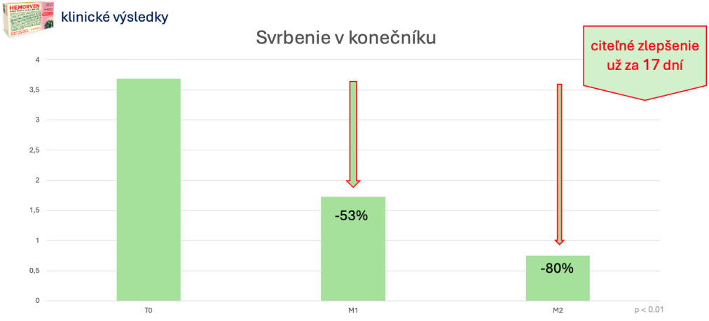 Užívanie produktu HEMORVEN viedlo k citeľnej úľave od svrbenia v konečníku už za 17 dní od prvého užitia, a po prvom mesiaci sa v priemere zmiernilo o 53%.