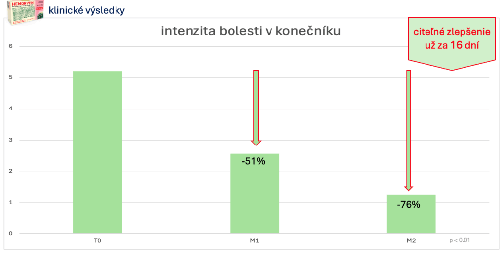 Užívanie produktu HEMORVEN viedlo k úľave od bolesti v konečníku už za 16 dní od prvého užitia, a po prvom mesiaci sa v priemere zmiernilo o 51%.