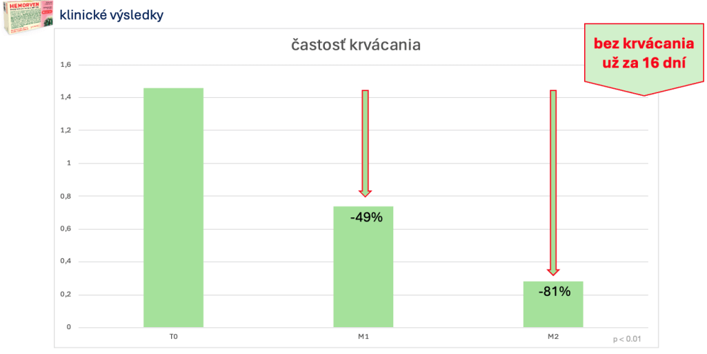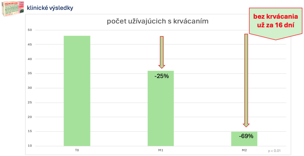 Užívanie produktu HEMORVEN zastavilo krvácania v konečníku v priemere už za 16 dní od prvého užitia, a po prvom mesiaci sa v priemere zastavilo u 25%, a po druhom mesiaci u 69% uživajúcich.