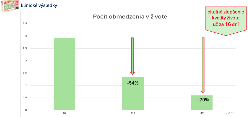 Užívanie produktu HEMORVEN viedlo k citeľnému zlepšeniu kvality života už ua 16 dní od prvého užitia, a celkovo sa obmedzenie v živote zmenšilo o 54% po prvom mesiaci užívania.
