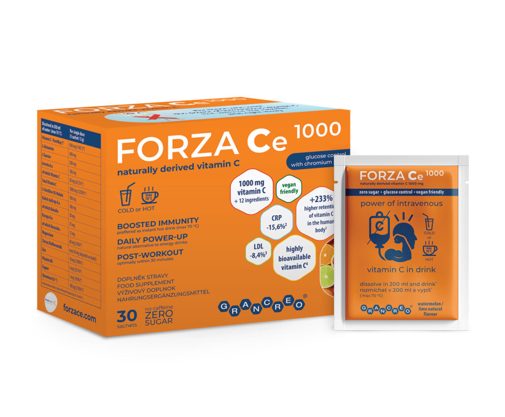 Doterajšie horúce nápoje na podporu imunity z lekárne sú účinné na tlmenie príznakov (bolesť, horúčka, celkový útlm). FORZA Ce 1000 ide ku koreňu veci – neutlmuje, ale dodáva bunkám palivo v maximálnej možnej kvalite a biologickej dostupnosti. Vychutnať si horúci nápoj, ktorý vás prehreje a zároveň dodá telu vysokú dávku efektívneho vitamínu C, je komfort, ktorý doterajšia technológia neumožňovala. S FORZA Ce 1000 máte príležitosť posunúť podporu imunity na vyššiu úroveň. A dá sa užívať ako zdravšia alternatíva energetických nápojov, ako chladený nápoj. Obsahuje 30 vrecúšok rozpustných vo vode.