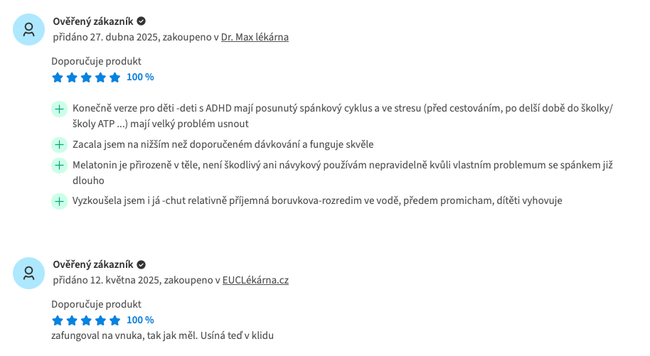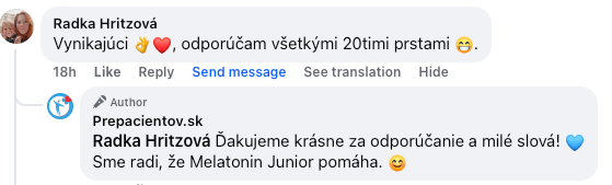 Tieto recenzie boli zozbierané z Facebookovej stránky (prepacientov.sk) a z portálu heureka.sk v roku 2025 na produkt MELATONIN JUNIOR priamo od jeho užívateľov, sú dohľadateľné.