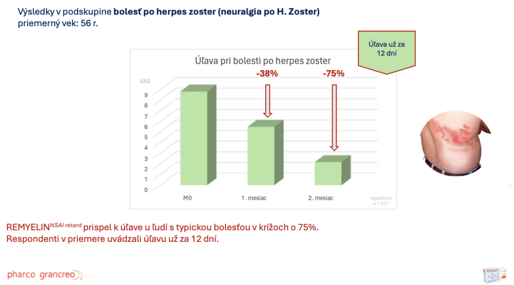 Jedinečné klinické skúšanie v SR v roku 2024 s produktom REMYELIN NSAI prebiehalo v 17-tich ambulanciach (až 11 z nich neurologických) na skupine ľudí s výraznou a pretrvávajúcou neurologickou bolesťou (neuralgia po herpes zoster) po dobu 2 mesiacov. Preukázalo skutočnú a rýchlu úľavu od bolesti po Herpes zoster. Ide o prevratné klinické skúšanie, ktoré doposiaľ v SR nemalo obdobu.