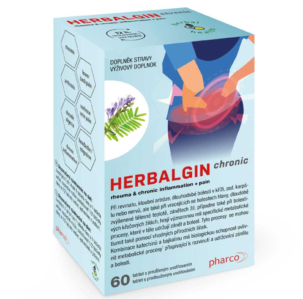 HERBALGIN chronic bol vyvinutý pre chronické alebo opakované zápaly a reumu. Obsahuje cielene upravenú a testovanú bylinnú zmes, ktorá v skúšaní preukázala účinné tlmenie tvorby derivátov kyseliny arachidonovej. Teda tých látok, ktoré vyvolávajú reumu v tele. HERBALGIN chronic je vo forme tabliet s predĺženým uvoľňovaním. Preto postačuje užívať 1 tabletu ráno a 1 tabletu večer, aby sa dosiahla dostatočne účinná hladina v krvi na potlačenie spomenutých látok. Tým sa výrazne zníži riziko vzniku zhoršenia (exacerbácie) reumy. Získať zásadné zlepšenie kvality života s reumou pri priemernej cene ani nie 1 Euro denne, už stojí za vyskúšanie.