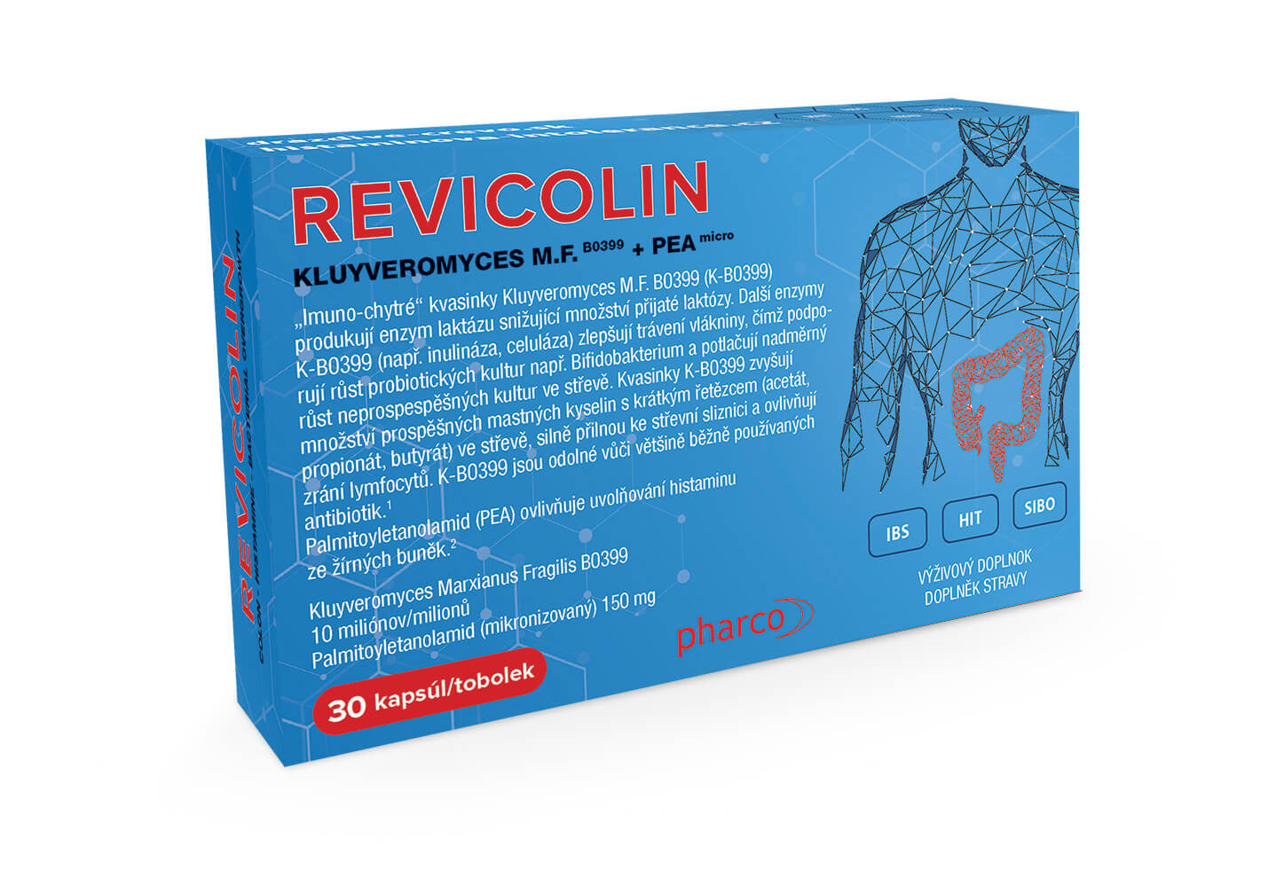 REVICOLIN je výživový doplnok vhodný najmä pri IBS a histamínovej intolerancii. Obsahuje dve účinné zložky, „imunochytré“ patentované kvasinky Kluyveromyces Marxianus Fragilis B0399 a telu prirodzenú látku palmitoyletanolamid (PEA). Kvasinky Kluyveromyces M.F. sú extrémne odolné a uvoľňujú veľmi prospešné látky, ktoré vyživujú výstelkové bunky sliznice. Tie sú potom odolné a pevne sa medzi sebou pospájajú, čím dochádza k uzatváraniu mikrotrhlín v črevnej výstelke. Palmitoyletanolamid (PEA) bráni nežiadúcej imunitnej odpovedi v podslizničnom imunitnom tkanive čreva, čím bráni opätovnej tvorbe „mikrotrhlín“ vo výstelke.