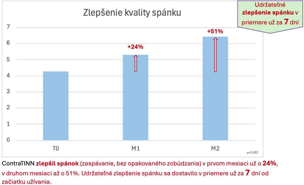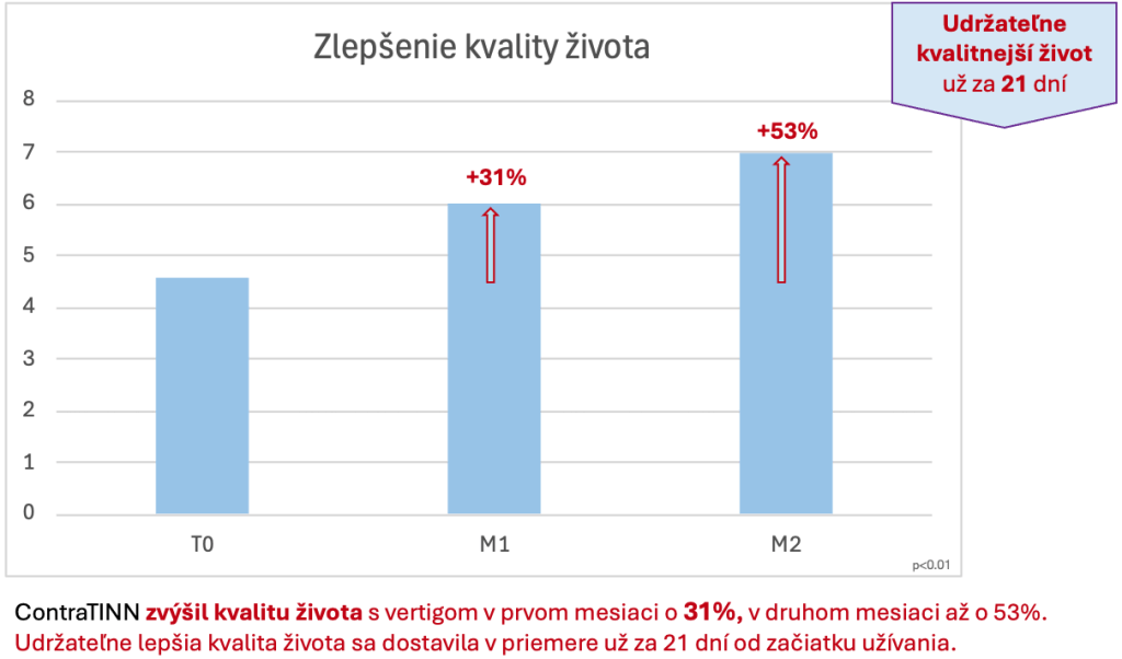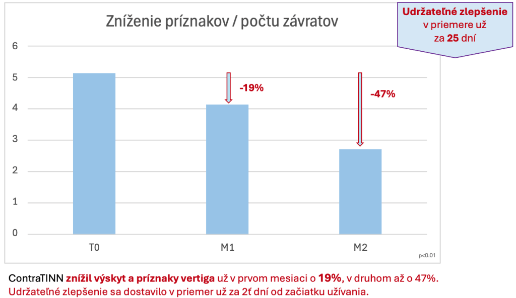 Jednou z aktuálnych možností, ako zmierniť príznaky alebo znížiť počet závratov, je užívanie novinky ContraTINN od slovensko-talianskej vývojovej spoločnosti PHARCO GRANCREO. ContraTINN je produkt zacielený na zlepšenie fungovania nervových zakončení vo vestibulárnom aparáte vnútorného ucha.Tento aparát je zodpovedný za pocitovú rovnováhu tela, ale napr. aj za príznaky tinnitu. ContraTINN v nedávnom klinickom skúšaní u respondentov s vertigom a/alebo tinnitom preukázal vysokú mieru zlepšenia už po prvom mesiaci užívania (pozri graf dolu).